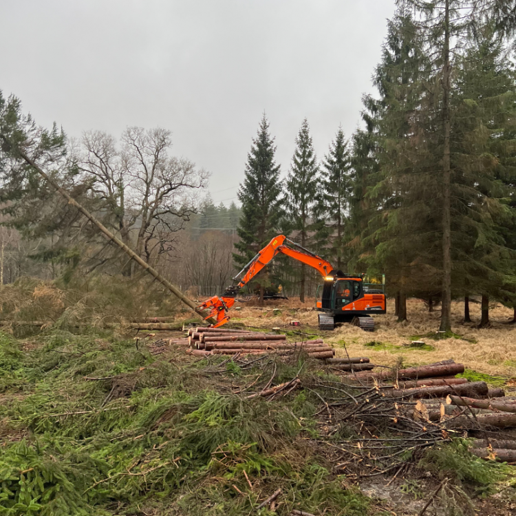 “Euroforest was instructed to fell, process and extract spruce timber from Oldhouse Warren in response to the presence of Ips typographus and a subsequent Statutory Plant Health Notice. As a professional harvesting company and member of the Forest Industry Safety Accord, Euroforest complies with the industry standards for working next to power lines. In this instance, the power lines could not be de-energised meaning that, whilst conventional harvesting was appropriate for most of the worksite, it could not be carried out in a defined area adjacent to the power lines (called the red zone). Wilson Tree Surgery, on behalf of UKPN, carried out the tree felling within the red zone and worked in conjunction with Euroforest’s harvesting machines to ensure an efficient and effective harvesting operation completed within the time constraints of the Statutory Plant Health Notice.”